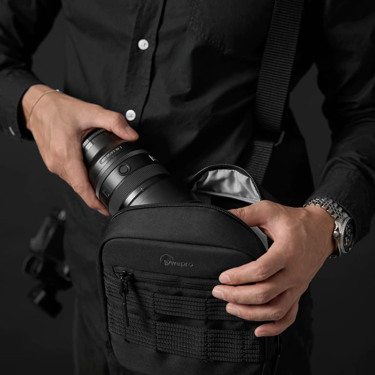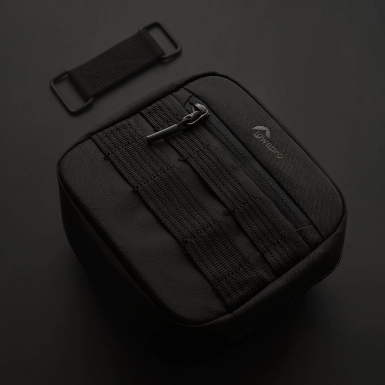 Por último e não menos importante: a bolsa/bolsa para lentes. Com a ProTatctic 100 AW da Lowepro, posso carregar minhas duas lentes prime sem muito volume. Eu a prendi ao arnês da câmera com um conector de extensão um pouco menor com 2 anéis de vedação quadrados de metal. Eles se encaixam perfeitamente na parte de trás da bolsa e são presos por velcro, os anéis de vedação facilitam o acesso quando preciso. Exatamente o que eu estava procurando com esta construção personalizada. Talvez eu apenas atualize o mini grampo com uma empunhadura/placa já com o sistema QD.