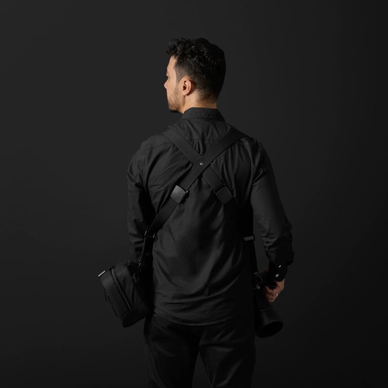 Diferentemente de muitos straps de câmera dupla disponíveis, minha ideia era ter uma bolsa de lente de um lado e a câmera do lado oposto, muito parecida com este disponível na ZUKA STRAPS, mas um que guarda até 2 lentes.